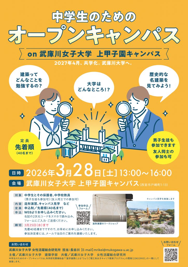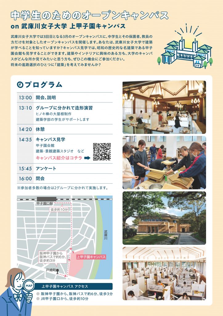 武庫川女子大学では3回目となる3月のオープンキャンパスに、中学生とその保護者、教員の方だけを対象としたオープンキャンパスを開催します。あなたは、武庫川女子大学で建築が学べることを知っていますか?キャンパス見学では、昭和の歴史的な名建築である甲子園会館も見学することができます。建築やインテリアに興味のある方も、大学のキャンパスがどんな所か見てみたいと思う方も、ぜひこの機会にご参加ください。将来の進路選択のひとつに「建築」を考えてみませんか?
