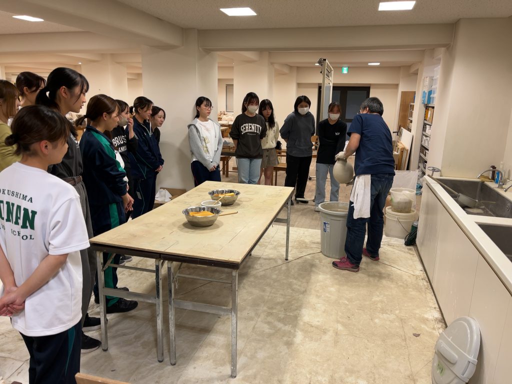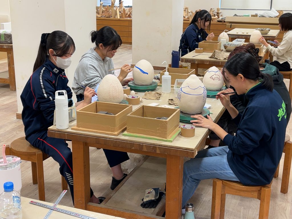 海の動物の映像を鑑賞し、各自がイメージを膨らませながら、2色の顔料を使い、筆で絵付けを行った。
