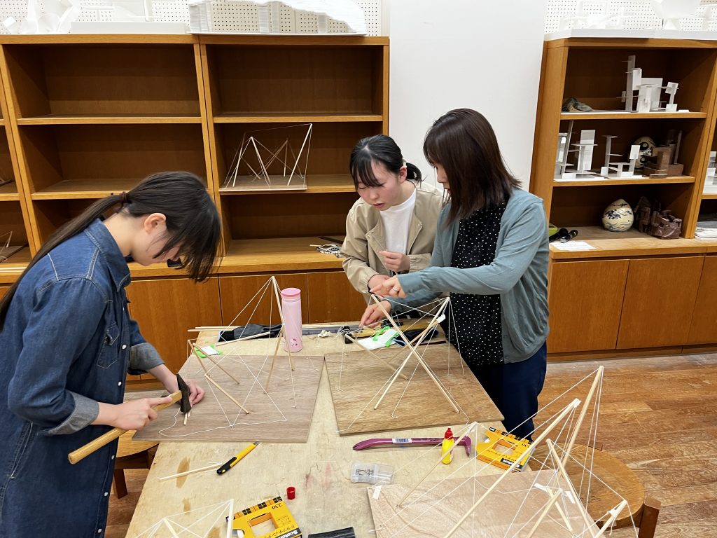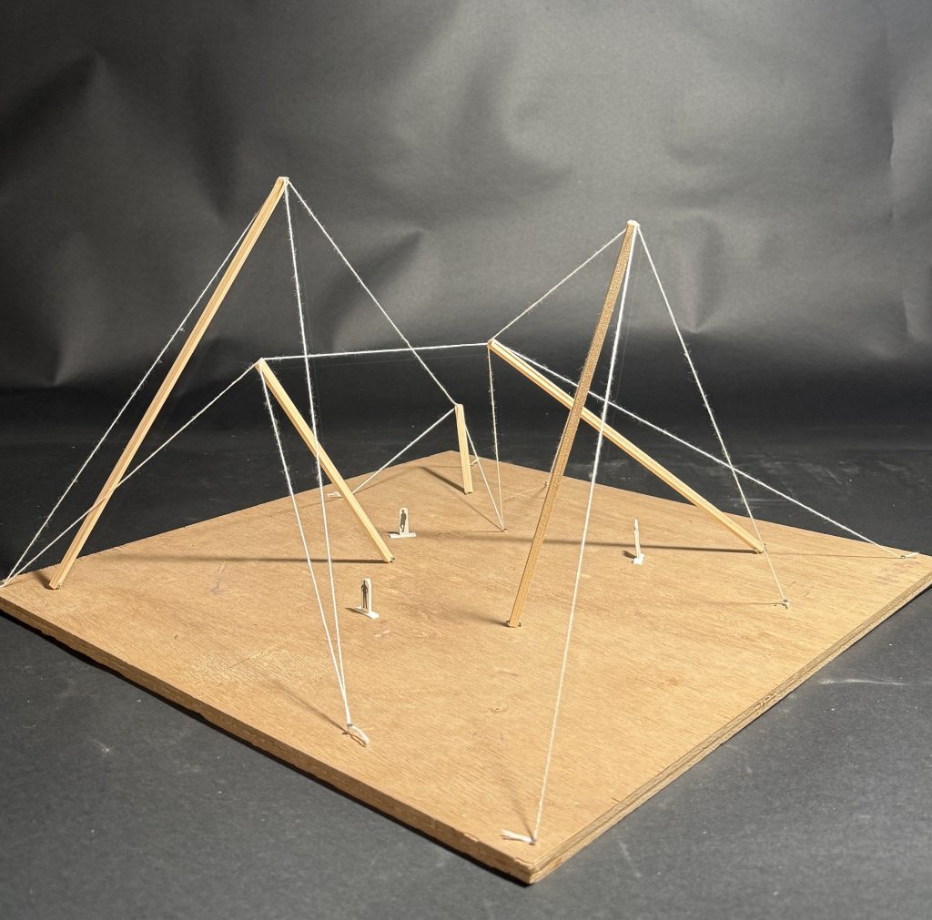 傾斜した木材の圧縮材と、紐の繊細な引張材が互いに支えあいながら、大屋根を作り出し、空間を形作っていることを表現した作品