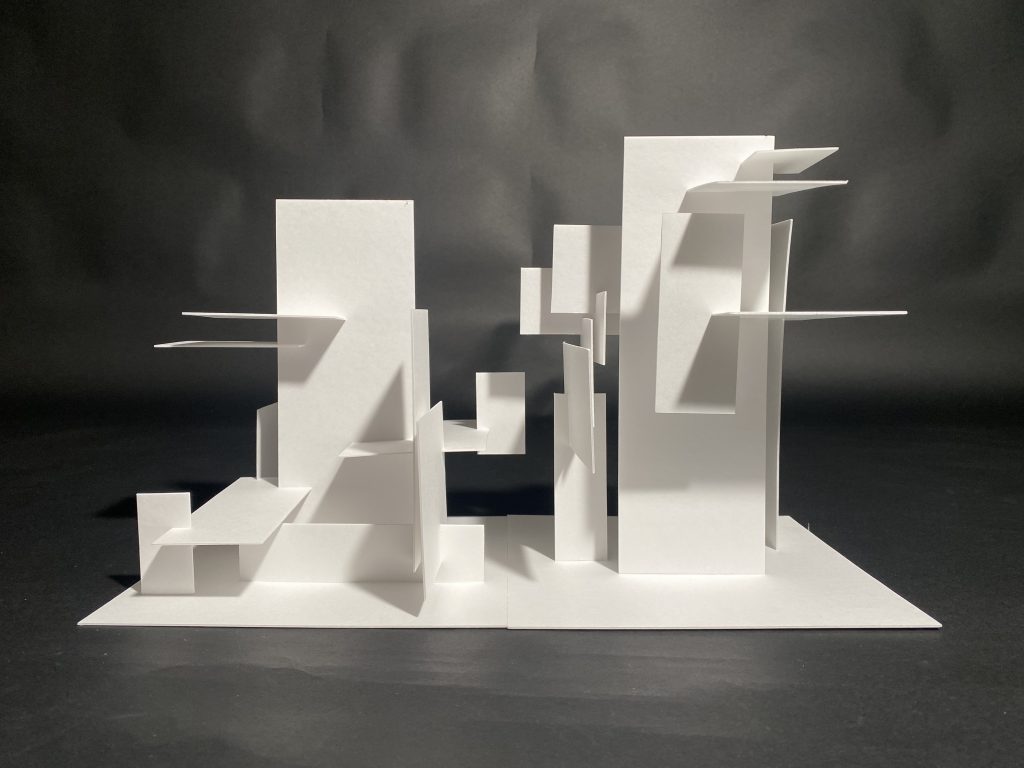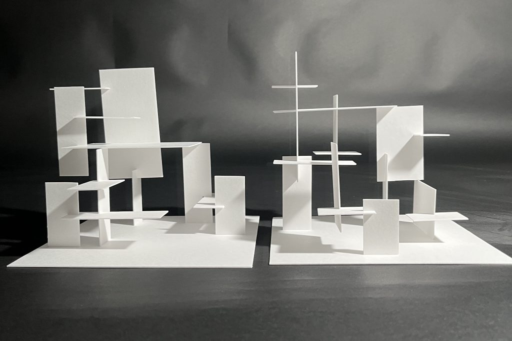 左の整数比による構成、右の黄金比による構成ともに、奥行きを重視して制作した作品