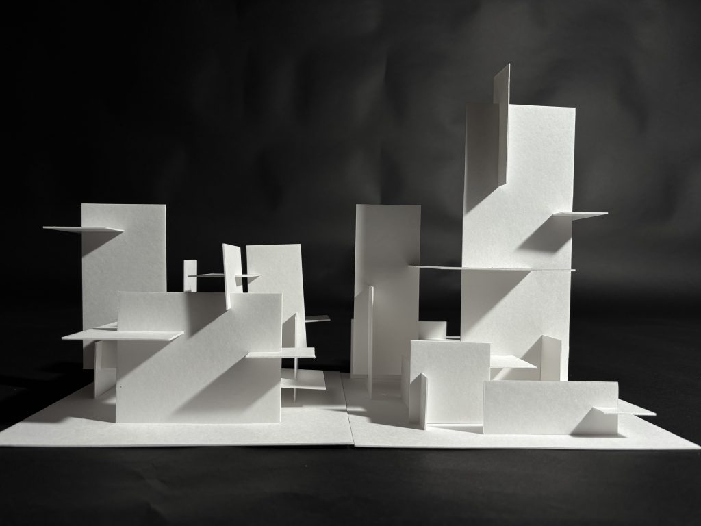 左の整数比による構成では影と光が差し込む部分のバランスを、右の黄金比による構成では奥に行くにつれて部材を大きくすることによる広がりを意識した作品